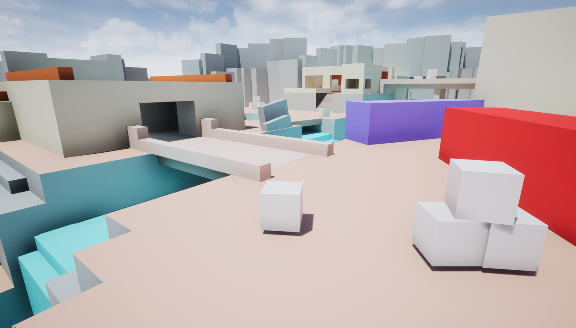 I started with a basic diagram of how the level could be broken up into sections, I tried to avoid moving into an entirely symmetrical design. Focusing my efforts on one key element at a time I assumed that the canals would provide the most impact into the actual design of the level, so each of my diagram options had these canals splitting the level in different ways. Originally I made this level much larger than I could handle for a one to two week project, It was about three times the size of the finished product which would require much more cover and buildings in between the sections to keep things interesting. This size was too large for me to build and prototype with in my set work period, so I cut the level in half and worked on the core routes.